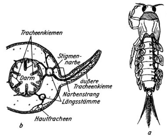 Tracheenkiemen: Tracheenkiemen der Insekten. a blattförmige Tracheenkiemen einer Eintagsfliegenlarve (Siphlurus), b kombiniertes Schema der Tracheenkiemen bei geschlossenem Tracheensystem