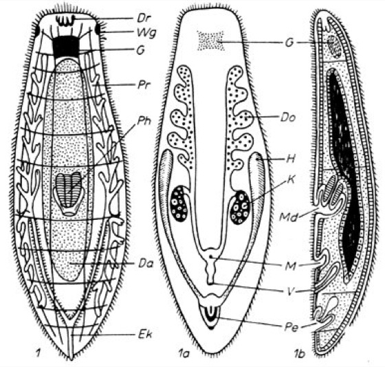 Turbellaria: Bau eines Strudelwurms. 1 und 1a Rückenansicht, 1b Längsschnitt. Da Darm, Do Dotterstock, Dr Frontaldrüse, Ek Mündung des Exkretionssystems, G Gehirn, H Hoden, K Keimstock, M Eileitermündung, Md Mund, Pe Penis, Ph Pharynx, Pr Protonephridien, V Begattungsöffnung, Wg Wimpergrube. (Nach Remane)