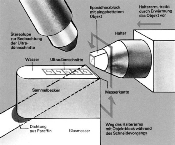 Ultramikrotom, ein feinmechanisches Präzisionsgerät zur Herstellung extrem dünner Schnittpräparate, wie sie für die Untersuchung von Proben im Transmissionselektronenmikroskop erforderlich sind (Mikroskop). Die Schnittdicken liegen im Unterschied zu Dünnschnitten eines Mikrotoms für die Lichtmikroskopie (Dicke ca. 5 μm) zwischen 25 und 100 nm, damit sie elektronenoptisch durchstrahlbar sind. Die eingebetteten Objekte werden in einem Präparatehalter fixiert, wobei der Vorschub durch Erwärmung des Haltearms gesteuert wird. Als Messer kommen beim U. Glas- oder Diamantmesser zum Einsatz. Die Ultradünnschnitte werden in einem Wassertrog aufgefangen und können anschließend auf Objektträger übertragen werden. ( vgl. Abb. )