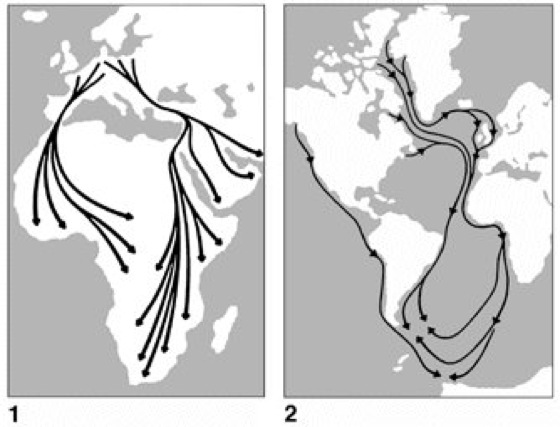 Vogelzug:1 Herbstwanderung des Weißstorchs (Ciconia ciconia). Störche, die in Frankreich und dem westlichen Deutschland nisten, wandern über Spanien, während diejenigen, die weiter im Osten nisten, das östliche Mittelmeer umfliegen. 2 Zugbahnen der Küstenseeschwalbe (Sterna paradisaea) von der Arktis bis zur Antarktis. Bemerkenswert ist, dass in der Arktis Nordamerikas brütende Küstenseeschwalben auf ihrer Herbstreise in die Antarktis den Atlantik überqueren