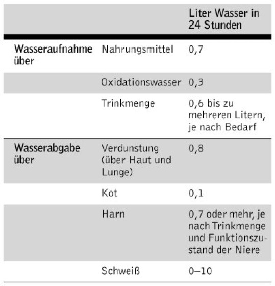 Wichtig ist die Konstanz von Volumen und Ionenzusammensetzung der einzelnen Kompartimente, was nur durch eine ausgeglichene Wasser- und Elektrolytbilanz nach außen erreicht werden kann. Wasseraufnahme und Wasserabgabe werden normalerweise im Wesentlichen durch orale Zufuhr (Trinken), Resorption in Darm und Niere, Ausscheidung über die Niere, Schweißsekretion und Bildung von Oxidationswasser bestimmt, die Elektrolytaufnahme und -abgabe vor allem durch die Resorption in Darm und Niere sowie die Verluste über den Schweiß. ( vgl. Tab. )