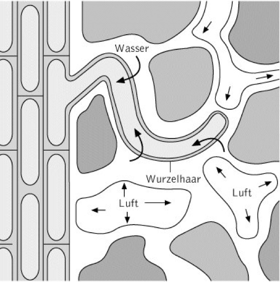 Wasseraufnahme: Schematische Darstellung der Wasseraufnahme im Boden. Dieser besteht aus mineralischen und organischen Bodenpartikeln, Bodenflüssigkeit und Luft. Durch die Wasseraufnahme (große Pfeile) vergrößern sich die luftgefüllten Hohlräume (kleine Pfeile) dergestalt, dass eine Saugspannung entsteht, sodass es zum Wassernachfluss aus wurzelferneren Regionen kommt. Ist dies aufgrund von Wassermangel nicht möglich, steigt die hydraulische Leitfähigkeit des Bodens an