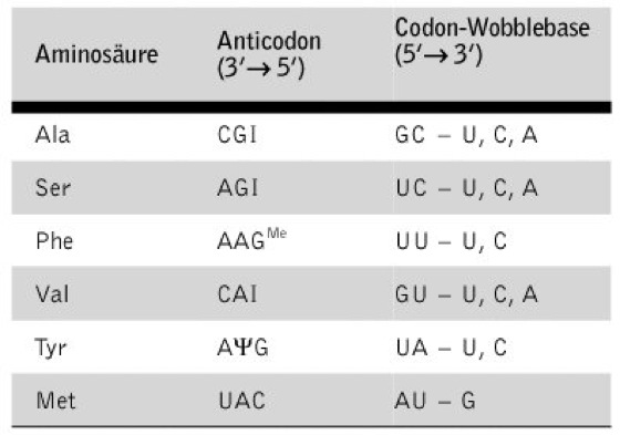 Wobble-Hypothese: Vergleich der Anticodons einiger Aminosäure-spezifischer tRNA-Arten mit den entsprechenden Codons