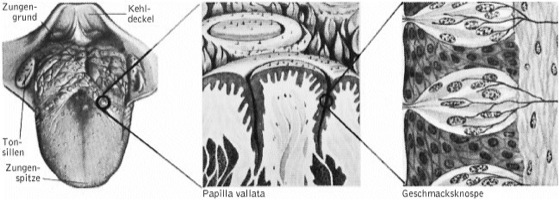 Zunge: Die Zunge des Menschen trägt über 200 Geschmacksknospen, die in kleinen Erhöhungen, den Papillen, besonders an der Oberseite der Zunge liegen. Auch an anderen Stellen in der Mundhöhle sind sie verstreut anzutreffen. Von den Nervenbündeln in den Geschmacksknospen werden Impulse auf Nervenfasern zum verlängerten Mark (Medulla oblongata) zur Brücke (Pons) und bis zum Geschmackszentrum in der Hirnrinde geleitet