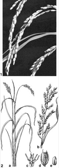 1 Rispen des Kultur-Reises (Oryza sativa). 2a Habitus der Reispflanze, b Rispe, c Blüte, d Ährchen, e Korn (Karyopse).