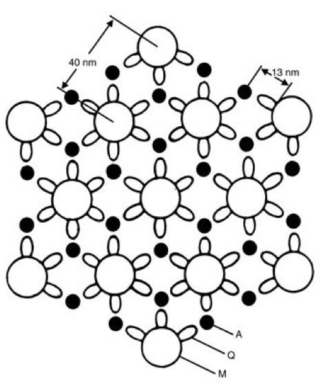 Querschnitt durch die A-Bande mit der gitterförmigen Anordnung der Myosinfilamente (M) mit Querbrücken (Q) und der Actinfilamente (A). Jedes Actinfilament ist von drei Myosinfilamenten, jedes Myosinfilament aber von sechs Actinfilamenten umstellt. Es gibt demnach doppelt so viele Actin- wie Myosinfilamente.