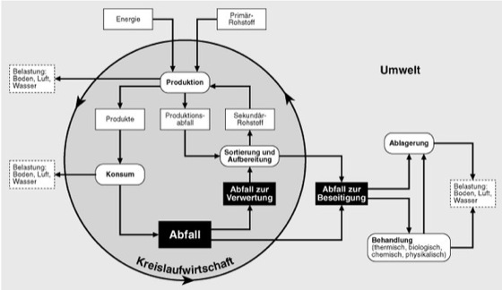 Abfall, umgangssprachlich Müll, früher auch Kehricht genannt, Rückstände, die bei Förderung und Aufbereitung von Rohstoffen, bei Fertigung, Aufbereitung oder Verbrauch von Gütern entstehen, sowie unverwertbare, kontaminierte oder verschmutzte Stoffe und Gegenstände, deren sich der Besitzer entledigt, entledigen will oder entledigen muß (vgl. Abb.). Kriterien für die Entledigungspflicht sind der Schutz der Gesundheit und die Bewahrung der Umwelt. Man unterscheidet ( vgl. Tab. ) Haushaltabfall, Sperrabfall, haushaltabfallähnlichen Gewerbeabfall, Industrieabfall, Bauschutt, Baustellenabfall, Erdaushub, Sonderabfall (Problemstoffe). Zum Abfall gehören nicht: radioaktive Stoffe (Radioaktivität), Sprengstoffe, Abwasser, Tierkörper sowie Fäkalien und sonstige in der Landwirtschaft verwertbare Stoffe. Das deutsche Kreislaufwirtschafts- und Abfallgesetz (KrWAbfG) von 1994 stellt erstmals auch verwertbare Stoffe (früher: Wertstoffe, Altstoffe, Sekundärrohstoffe) unter den Begriff Abfall, also Papier, Glas, Metall, Kunststoff, Bioabfall (Grüngut, Speisereste). Es unterscheidet diese "Abfälle zur Verwertung" von den (unverwertbaren) "Abfällen zur Beseitigung". Abfallverwertung hat Vorrang vor Abfallbeseitigung – es sei denn, diese sei besser umweltverträglich. Stoffliche wird von energetischer Verwertung unterschieden; Vorrang hat hier die besser umweltverträgliche Verwertungsart. Die juristischen Abgrenzungen von Abfall zur Verwertung und Abfall zur Beseitigung sowie der Verwertungs- und Beseitigungsverfahren sind umstritten. – Die Zusammensetzung des Abfalls aus Haushalten hat im 20. Jahrhundert stark gewechselt. Bis in die 50er Jahre dominierten mineralische Anteile: Asche, Staub, Steine, Scherben; organisches Material fehlte weitgehend, da es kompostiert (Kompost) oder verfüttert wurde. Metall und Textilien wurden von wandernden Händlern ("Schrottsammler", "Lumpensammler") auf Handwagen oder auf Lkw gesammelt. Nahezu alle Glasflaschen waren mit Pfand belegt, Holz und Papier wurden verbrannt, es gab nur wenige Kunststoffprodukte (Kunststoffe). Seit den 60er Jahren lösten Supermärkte die Kleinläden ab, die Warenverteilung wurde zentralisiert, längere Haltbarkeit der Waren und bessere Transporteigenschaften waren erwünscht, die Hygienevorschriften wurden verschärft, weshalb immer mehr Waren verpackt angeboten wurden. Die Palette verpackter Produkte wurde stark erweitert (z. B. Milchprodukte, Körperpflegemittel, Haushaltswaren, Unterhaltungselektronik). Der Konsum insgesamt und dabei die Menge von Einwegverpackungen und Einmalprodukten stiegen; der Mehrfachgebrauch und die Verwertung im Haushalt (Verbrennen, Kompostieren) wurden weitgehend aufgegeben. Ende der 80er Jahre wurde der "Müllberg" zu einem Politikum. Einerseits ging der verfügbare Deponieraum (Deponie) zur Neige, andererseits regte sich an möglichen Standorten für Entsorgungsanlagen (z. B. Deponien, Müllverbrennungsanlagen, Sortieranlagen, Kompostwerke) Widerstand in der Bevölkerung. Um den "Abfall zur Beseitigung" zu verringern, wurden regelmäßige getrennte Sammlungen für den "Abfall zur Verwertung" eingeführt, zunächst Glascontainer und Papiercontainer. 1991 wurden Hersteller und Vertreiber von Verpackungen durch die Verpackungsverordnung zur Rücknahme und Verwertung (Recycling; Abfallverwertung) ihrer Verpackungen verpflichtet. Industrie und Handel reagierten darauf mit der Gründung des "Dualen Systems". Mitte der 90er Jahre wurde in vielen Regionen flächendeckend die Sammlung biologischer Abfälle mit der "Biotonne" eingeführt. Weitere Verordnungen zur getrennten Sammlung bestimmter Stoffe und Produkte sind derzeit (1998) im Gespräch. Abbau, abbaubare Kunststoffe, Abbaubarkeit, abbauresistente Stoffe, Bioenergie, Kläranlage, nachwachsende Rohstoffe, Rotte, Wasserverschmutzung.