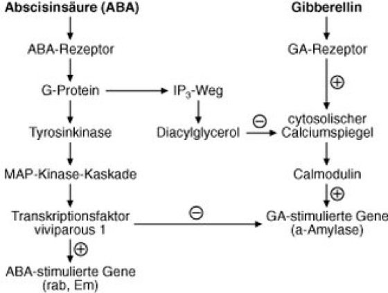 Abscisinsäure [von latein. abscisus = abgeschnitten], Abscisin, Dormin, Abk. ABA (von englisch abscisic acid), ein Phytohormon, das als Gegenspieler zu anderen Phytohormonen, wie den Auxinen, Gibberellinen und Cytokininen, wirkt (Strukturformel ä vgl. Abb. ). Abscisinsäure hemmt bei den verschiedensten Höheren Pflanzen das Wachstum und die Samenkeimung (Keimung), löst die Samenruhe aus und fördert den Blatt- und Fruchtfall. In der Pflanze erfüllt Abscisinsäure die Funktion eines Streßhormons, das in Reaktion auf verschiedene streßerzeugende Umweltfaktoren (Kälte, Trockenheit, Salzstreß) gebildet wird (Streßfaktoren bei Pflanzen, Streßresistenz bei Pflanzen). Nach Abklingen des streßerzeugenden Einflusses wird der erhöhte ABA-Pegel wieder abgesenkt. – Abscisinsäure ist eine Sesquiterpenverbindung (Sesquiterpene), deren Synthese vom Mevalonat (Mevalonsäure) ausgeht. Sie entsteht durch die Spaltung des Tetraterpengerüstes der Carotinoide. Die Synthese von Abscisinsäure (ävgl. Abb.) kann in vielen Teilen der Pflanze erfolgen, vor allem in Blättern, Wurzeln und reifenden Früchten. ABA wird von den Zellen in den Apoplasten (Apoplast) ausgeschieden und konnte sowohl im Xylemwasser als auch im Phloemsaft nachgewiesen werden. Besonders gut ist die Wirkung von Abscisinsäure bei Wasserstreß untersucht. Die Erhöhung der ABA-Konzentration in den Blättern führt durch die Aktivierung von Ionenkanälen und einen nachfolgenden Ausstrom von Wasser zu einem Turgorabfall (Turgor) in den Schließzellen des Spaltöffnungsapparats und somit zu einem Verschluß der Stomata (Spaltöffnungen), wodurch ein Wasserverlust durch Transpiration verhindert wird (Antitranspirantien). Weitere wichtige physiologische Wirkungen von Abscisinsäure sind: die Umstellung der CO2-Fixierung vom C3-Weg auf den C4-Weg der Photosynthese unter Einwirkung von Wasserstreß bei CAM-Pflanzen (diurnaler Säurerhythmus; C3-Pflanzen, C4-Pflanzen); die Förderung der Dormanz (Aufrechterhaltung von Ruhezuständen) in Samen (Samenruhe) und Knospen (Knospenruhe) und die Förderung des Blattfalls und Fruchtfalls (Abscission). Die genaue Funktion von Abscisinsäure bei der Abscission von Früchten und Blättern ist noch wenig geklärt, da hierbei neben Abscisinsäure auch andere Phytohormone, wie Cytokinine, IAA (Indol-3-essigsäure) und Ethylen, in erheblichem Umfang beteiligt sind. Außerdem löst Abscisinsäure nach neueren Erkenntnissen auch physiologische Vorgänge aus, die zu einer erhöhten Frostresistenz der Pflanzen beitragen. In Zellkulturen sind nach Gabe von ABA Anpassungsprozesse zu beobachten, wie sie auch nach Kältebehandlung eintreten (Änderungen im Kohlenhydratstoffwechsel). Sowohl bei frostempfindlichen als auch bei frosttoleranten Weizensorten (Weizen) läßt sich die Frostresistenz durch eine Behandlung mit ABA verbessern, während Kältebehandlung allein bei frostempfindlichen Sorten kaum eine Zunahme der pflanzlichen ABA sowie der Frosttoleranz zur Folge hat. Dies bedeutet, daß bei der Züchtung kälteresistenter Kulturpflanzen der natürliche Hormonspiegel als Auswahlkriterium genutzt werden könnte. – Der durch Abscisinsäure ausgelöste Signalweg wurde für die Hemmung der Samenkeimung teilweise aufgeklärt. Hier tritt Abscisinsäure als hemmender Antagonist zum Gibberellin auf. Gibberellin induziert in der Aleuronschicht (Aleuron) von Getreidesamen die Synthese von α-Amylase (Amylasen), die Stärke zu Zucker umsetzt und so den Keimling mit Nährstoffen versorgt. Durch Mikroinjektion in Aleuronzellen konnte gezeigt werden, daß der ABA-Rezeptor in der Plasmamembran sitzt. Die Bindung an den Rezeptor setzt zwei über G-Proteine vermittelte Signalwege in Gang ( ä vgl. Abb. ). Der eine Signalweg schaltet über eine Tyrosinkinase eine MAP-Kinase-Kaskade (MAP-Kinase) in Gang. Diese Kaskade mündet in der Synthese oder Aktivierung des Transkriptionsfaktors viviparous 1. Das viviparous-1-Gen wurde aus einer Vivipariemutanten von Mais kloniert. Bei dieser Mutante keimen die Samen noch auf der Mutterpflanze aus (Viviparie). Diese Mutante läßt sich nicht durch die Gabe exogener Abscisinsäure heilen, betrifft also nicht die Synthese von Abscisinsäure, sondern einen Schritt der Hormonantwort. Das viviparous-1-Protein bindet an sog. ABA-responsive-Elemente im Promotor von ABA-induzierten Genen und schaltet sie dadurch an (z. B. die Gene Em oder rab). Es bindet aber auch an Promotoren von Gibberellin-induzierbaren Genen und bewirkt dort eine Abschaltung (z. B. bei der α-Amylase). Der zweite vom ABA-Rezeptor angestoßene Signalweg führt über den IP3-Signalweg (IP3) und Diacylglycerol zu einer Absenkung des cytoplasmatischen Calciumspiegels und hemmt dadurch die Gibberellinwirkung (Gibberellin induziert das α-Amylase-Gen über eine Erhöhung des Calciumspiegels). Die antagonistische Wechselwirkung von ABA und Gibberellin findet also auf zwei Ebenen statt. Kälteinduzierte Gene zeigen zusätzlich zu den ABA-responsive-Promotorelementen noch weitere Sequenzmotive auf. Die von Abscisinsäure ausgelöste Streßreaktion ist also vermutlich nur ein Pfad in einem Netzwerk paralleler Signalwege. Jasmonat-induzierte Proteine.