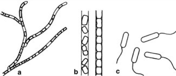 Abwasserpilz (Sphaerotilus natans): a zusammenhängende Bakterienfäden, b Zellen in den Scheiden, c frei bewegliche Zellen