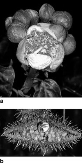 Achote m [von span. achiote, achote, =], Anattostrauch, Orleanbaum, Bixa orellana (benannt nach dem spanischen Entdecker F. de Orellana, 1511–1549), einzige Art der Bixaceae, ein 5–10 m hoher, aus dem tropischen Amerika stammender Baum oder Strauch mit einfachen, spiralig gestellten, handnervigen, zugespitzten Laubblättern und pfirsichroten, zu Rispen angeordneten Blüten (vlg. Abb.) mit zahlreichen Staubblättern. Die Frucht ( vgl. Abb. ), eine etwa walnußgroße, mit weichen Stacheln besetzte, braunrote Kapsel, enthält zahlreiche Samen, aus deren rotem Samenmantel Anatto (Orlean), ein rotgelber, ungiftiger Naturfarbstoff, gewonnen wird, der das rote Bixin und Orellin enthält. Anatto wird heute besonders zum Färben von Lebensmitteln sowie von Salben und Seifen verwendet. Zum Färben von Textilien wird es wegen seiner geringen Lichtbeständigkeit nur noch selten eingesetzt. Achote, eine der ältesten amerikanischen Kulturpflanzen, wird heute im ganzen Tropengebiet kultiviert und dient auch als Heil- und Zierpflanze.