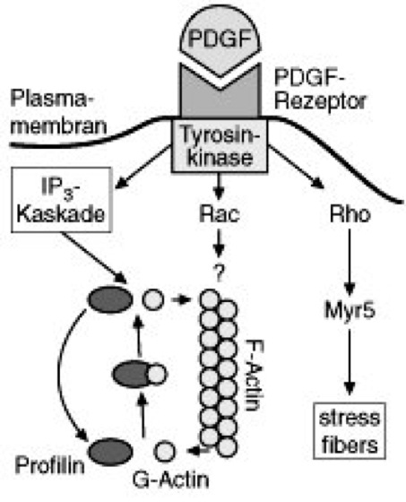 Actin s [von latein. actio = das In-Bewegung-Setzen], Aktin, Strukturprotein, das in allen eukaryotischen Zellen (Eucyte, Zelle) am Aufbau des Zellskeletts und von Haftstrukturen, an der Signalübertragung (Signaltransduktion) durch Zellmembranen (Membran) sowie an der Erzeugung verschiedener Formen von Zellbewegung (Bewegung) beteiligt ist und einen bedeutenden Anteil am zellulären Gesamtprotein ausmacht (in Leberzellen 1–2%, in amöboid beweglichen Zellen bis zu 17%, in Säugermuskeln bis zu 25%). Bei Prokaryoten fehlt Actin generell. – Actin wird als monomeres G-Actin (globuläres Actin) synthetisiert und besteht aus einer einzigen Polypeptidkette mit einer relativen Molekülmasse von 40 000–45 000 (je nach Spezies und Actin). Die G-Actin-Monomere zeigen eine deutliche Polarität. An ihrer Plus-Seite vermögen sie 1 Ca2+-Ion, ATP (Adenosintriphosphat) oder ADP (Adenosin-5´-diphosphat) mit hoher Affinität zu binden. Bei Anwesenheit von K+- oder Mg2+-Ionen polymerisieren die Monomere in vitro spontan unter Hydrolyse von ATP zu perlschnurartigen Ketten aus F-Actin (filamentäres Actin). Pro angefügtem Molekül G-Actin wird 1 Molekül ATP zu ADP und Pi (Pi = anorganisches Phosphat) hydrolysiert. Das dabei entstehende ADP bleibt an die G-Actin-Untereinheit in der F-Actin-Kette gebunden. In der Regel winden sich dann 2 derartige Ketten zu einem Doppelfilament (Actinfilament) umeinander. Unter den physiologischen Bedingungen der Zelle wird der Grad der Polymerisation und Depolymerisation des Actins durch eine Reihe Actin-bindender Proteine gesteuert. – Actin wurde erstmals 1942 von F.B. Straub im Labor von A. Szent-Györgyi (Szeged) aus einer Myosin B-Fraktion (Actomyosin) der Kaninchen-Skelettmuskulatur isoliert und als eigenes Protein beschrieben. Heute weiß man, daß die Actine eine ganze Familie sehr konservativer, in ihren Eigenschaften (Polymerisation, Wechselwirkung mit Hilfsproteinen, ATP- und Myosinbindung) überaus einheitlicher Proteine darstellen. Entsprechend ihren Funktionen in der Zelle unterteilt man sie in 2 Gruppen: die namentlich am Aufbau des Muskulatur (Myofibrillen) beteiligten α-Actine und die cytoplasmatischen β-Actine und γ-Actine. In den meisten Organismen und Zelltypen werden mehrere dieser Actine gleichzeitig ausgebildet, codiert durch eine ganze Familie von Actingenen (Multigenfamilie), die durch Genduplikation auseinander hervorgegangen sind. Bei Säugern kennt man deren 6, bei dem amöboid kriechenden Schleimpilz Dictyostelium sogar 17 verschiedene Actingene. – In pflanzlichen wie tierischen Zellen sind Actine, gewöhnlich in Zusammenwirkung mit Myosinen (Myosin, sliding-filament-Mechanismus; vgl. Abb. ), entscheidend an der Erzeugung intrazellulärer Bewegungsvorgänge beteiligt, wie Plasmaströmung und amöboider Bewegung. Zudem spielen sie bei der Bildung von Kontaktstrukturen zwischen Zellen (junctions) und bei der Adhäsion an Substrate (Adhäsine, Zelladhäsion) eine wichtige Rolle. Die Steuerung der Actindynamik durch Signalketten wurde an Fibroblasten genauer untersucht ( vgl. Abb. ). Hier werden durch rezeptorvermittelte Signalwege (angeregt z. B. durch den platelet-derived growth factor; PDGF) innerhalb von 30 Minuten 2 mit der Chemotaxis zusammenhängende Reaktionen des Actinskeletts aktiviert: 1) die Ausbildung von Lamellipodien (Pseudopodien) in Richtung des Signals (sog. ruffling), wobei Actin am Außensaum des Lamellipodiums polymerisiert, an dessen Basis jedoch abgebaut wird (treadmilling); 2) die Bildung langer Actinbündel von der Zellmitte in Bewegungsrichtung, die für Adhäsion und Zusammenhalt der Fibroblasten wichtig sind (sog. stress fibers). Die einzelnen Schritte der entsprechenden Signalübertragungswege werden durch kleine GTPasen (Guanosintriphosphatasen), wie Rho, Ras und Rac, ausgelöst. Rho steht in Wechselwirkung mit einem Myosin und steuert so die Bildung der stress fibers. Parallel wird über die Inositol-3-phosphat-Kaskade die Bindung des Actin-bindenden Proteins Profilin an G-Actin gelöst und so die Polymerisation von G-Actin zu F-Actin freigegeben. Dies gilt als entscheidender Schritt für die chemotaktische Ausrichtung der Lamellipodien amöboider Zellen. Actin kann jedoch auch selbst als Glied der Signaltransduktion wirken: Die Wanderung des Glucocorticoidrezeptors in den Kern wird über eine durch ein Hitzeschockprotein 90 vermittelte Verankerung an Actin unterbunden. Nach Gabe von Steroidhormonen löst sich diese Bindung, und der Rezeptor wandert an seinen Wirkort in den Kern. In ihrer am leichtesten durchschaubaren Anordnung liegen Filamente aus α-Actin in den Myofibrillen von Muskelzellen vor, besonders in quergestreifter Muskulatur. Zusammen mit Myosinfilamenten (Myosinfilament) bilden sie den Motor der Muskelkontraktion und machen als Actomyosin-Komplexe bis zu 80% des muskulären Gesamtproteins aus. – In Pflanzenzellen erfüllen Actine noch eine Vielfalt weiterer Funktionen. So wird die Durchlässigkeit der Plasmodesmen über Actin gesteuert, durch Zerstörung der Actinfilamente mit Cytochalasin D (Cytochalasane) werden die Plasmodesmen auch für größere Proteine durchlässig. Darüber hinaus ist Actin für die Festlegung der Zellteilungsachse wichtig. Hierfür haben Pflanzen eine spezielle Actinstruktur, das sog. Phragmosom (Phragmosomen), entwickelt, das für die Zellteilung wichtige Mikrotubulistrukturen (Präprophaseband und Phragmoplast; Mikrotubuli) organisiert. Actinfilamente spielen auch bei der auxinabhängigen Zellstreckung eine Rolle. Zum einen ist der Efflux-Carrier des Pflanzenhormons Auxin wahrscheinlich an Actin gebunden, zum anderen geht die wachstumshemmende Wirkung von Aluminium zumindest teilweise auf eine Bündelung und Versteifung der Actinfilamente zurück. Auch für die Abwehrreaktion pflanzlicher Zellen gegen Pilzbefall ist Actin notwendig (pflanzliche Abwehr). Nach Zerstörung der Actinfilamente durch Cytochalasin D können verschiedene Getreidesorten von Pilzen befa