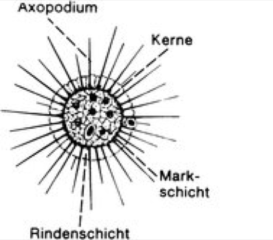 Actinosphaerium s [von *actino –, griech. sphairion = Kügelchen], Sonnentierchen, Gattung der Sonnentierchen i.w.S. (Heliozoa); große Einzeller mit zahlreichen Kernen ( vgl. Abb. ); Mark- und Rindenschicht sind deutlich getrennt. Bekannteste Art ist Actinosphaerium eichhorni, die in flachen Gewässern an Pflanzen und im Bodensatz lebt; sie ist bis 1 mm groß und erträgt auch ziemlich verschmutztes Wasser.