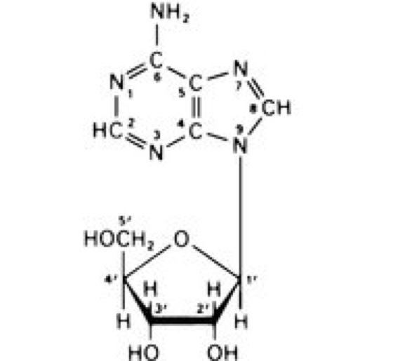 Adenosin s [von *adeno -], Abk. A, seltener Ado, ein Nucleosid (Purinnucleoside), das aus Adenin und β-D-Ribose aufgebaut ist ( vgl. Abb. ); Bestandteil von Ribonucleinsäuren sowie von Coenzymen und Nucleosidantibiotika. Adenosin-Kinase, Purinabbau, Schlaf.