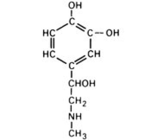 Adrenalin s [von *adren -], Epinephrin, Suprarenin, Vasotonin, Vasokonstriktin, Hormon des catecholaminogenen Adrenalgewebes (Nebennierenmark; bei Säugern der Medulla); erstmals 1901 von J. Takamine isoliert. Die Synthese erfolgte 1904 durch Stolz und Dakin und war die erste künstliche Darstellung eines Hormons (Hormone). Adrenalin ( vgl. Abb. ) ist ein Derivat des Brenzcatechins (engl. catechol) und kommt in allen Wirbeltieren und einigen Wirbellosen vor. Der Titer im Blut des Menschen beträgt maximal 0,01 μg/100 ml Plasma bei einer Halbwertszeit von 2 Minuten. Die Biosynthese erfolgt über Tyrosin, das der Nahrung entnommen oder durch Hydroxylierung von Phenylalanin in der Leber gebildet wird. Geschwindigkeitsbestimmender Schritt der Synthese ist die Hydroxylierung des Tyrosins zu DOPA (Dihydroxyphenylalanin). Die Ausschüttung wird durch einen Reiz des Nervus splanchnicus des Sympathikus veranlaßt. Adrenalin wirkt mit gleicher Affinität auf die adrenergen Rezeptoren α1, α2, β1 und β2. Im Kohlenhydratstoffwechsel ist Adrenalin Gegenspieler des Insulins. Über β1- und β2-Rezeptoren aktiviert Adrenalin ein G-Protein, welches das in der Zellmembran lokalisierte Enzym Adenylat-Cyclase stimuliert. Dies führt zur Bildung des second messenger cAMP (sekundäre Boten, Adenosinmonophosphat). cAMP aktiviert die Proteinkinase A. Am Ende der Signalkette stehen ein Abbau der Reserven von Glykogen in der Leber und eine Freisetzung von Glucose ins Blut (Blutzucker). Über α1-Rezeptoren bewirkt Adrenalin eine Kontraktion der glatten Muskulatur. So verengen sich periphere Gefäße. In höheren Dosen erhöht Adrenalin über β1-Rezeptoren an der glatten Muskulatur die Schlagkraft, Schlagfrequenz und Erregbarkeit des Herzens (Herz, Herzmechanik, Herzautomatismus). Aufgrund dieser kardialen Wirkungen wird bei Herzstillstand Adrenalin gegeben. Außerdem hemmt Adrenalin die Darmbewegungen (Darm), löst den Krampf der Bronchialmuskulatur (über β2-Rezeptoren; Asthma bronchiale) und erweitert die Pupille. Synthetisches Adrenalin (Suprarenin) wird als Zusatz zu Lokalanästhetika verwendet. Es mindert die Blutung und verlängert die Wirkung der Anästhesie (Lokalanästhesie). Im adrenergen (sympathischen) Nervensystem ist Adrenalin neben dem ähnlich wirkenden Noradrenalin chemische Erregungsüberträgersubstanz (Neurotransmitter) von Nervenreizen. Als Antagonist wirkt das Acetylcholin des parasympathischen Nervensystems (Parasympathikus). Abel (J.J.), Cannon-Notfallreaktion, Catecholamine (Abb.), Holtz (P.W.J.), Hormone (Farbtafel), Ionenkanäle, Loewi (O.), Neurotransmitter, Signaltransduktion, Streß, Synapsen, Takamine (J.).