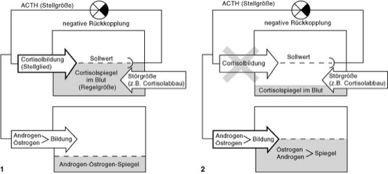 Der Enzymdefekt beim adrenogenitalen Syndrom kann in der Sprache der Regeltechnik als Störgröße bezeichnet werden. Sie wirkt aber nicht direkt auf die Regelgröße ein, sondern indirekt über das Stellglied: die Cortisolproduktion. Somit kann der Sollwert (Cortisolspiegel) nicht erreicht werden, was zu einer Erhöhung des ACTH-Spiegels führt. Die Abb. zeigen die Regulation des Cortisolspiegels im Blut 1 beim gesunden Organismus, 2 im Falle des adrenogenitalen Syndroms.
