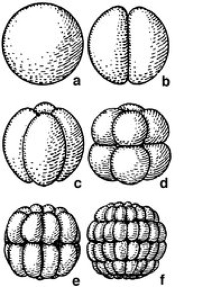 Schema der total-äqualen Furchung am Beispiel des Seeigeleies: a Ei, b 2-Zellstadium, c 4-Zellstadium, d 8-Zellstadium, e 16-Zellstadium, f Morula