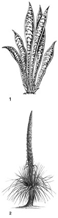 1 Sansevieria trifasciata, wird als "Schwertpflanze" in verschiedenen Sorten, zum Teil mit gelben Blatträndern, als Zierpflanze gezogen; 2 Dasylirion spec.