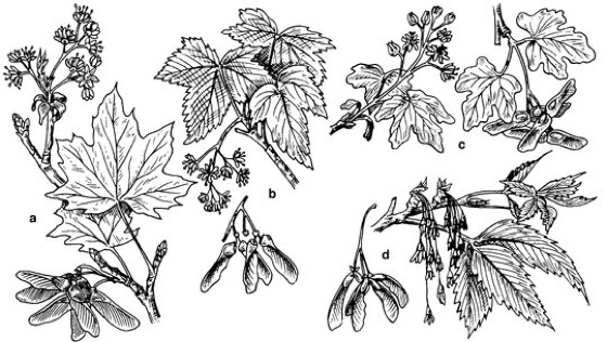 a Spitz-Ahorn (Acer platanoides), b Berg-Ahorn (Acer pseudoplatanus), c Feld-Ahorn, Masholder (Acer campestre), d Eschen-Ahorn (Acer negundo)