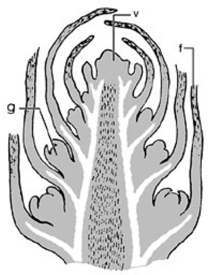 Sproßscheitel einer Samenpflanze mit Vegetationspunkt (v) und den Anlagen für Blatt (f) und Seitenzweige (g)