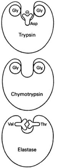 Das aktive Zentrum bei verwandten, aber unterschiedlich spaltenden Proteasen der Bauchspeicheldrüse (Pankreas) bzw. des Darmtrakts (stark vereinfacht): Trypsin, Chymotrypsin, Elastase