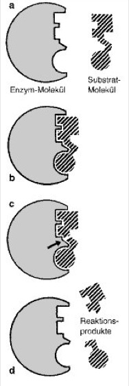 a Enzym- und Substrat-Molekül frei, b Verbindung des Enzyms mit dem Substrat, c Reaktion des Substrats (in diesem Fall Spaltung), d Ablösung der Reaktionsprodukte vom Enzym