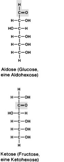 Aldosen – Ketosen: Unter den Zuckern werden als Gruppen unterschieden die Aldosen (z.B. Glucose) mit einer Aldehydgruppe am C-Atom 1 und die Ketosen (z. B. Fructose) mit einer Ketogruppe an einem inneren C-Atom, meistens am C-Atom 2. Die Endung -ulose kennzeichnet Ketosen.