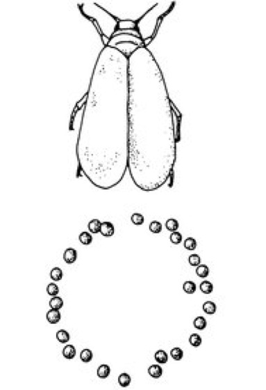 Aleurodina [von *aleuro –, griech. dinē = Wirbel], Aleyrodina, Mottenläuse, Mottenschildläuse, Schildmotten, Schmetterlingsläuse, Weiße Fliegen, Unterordnung der Pflanzensauger, Schwestergruppe der Psyllina (Blattsauger); in Mitteleuropa nur 1 Familie mit ca. 15 Arten. Die Imagines sind ca. 2 mm groß, Flügel in der Ruhe dachförmig übereinandergelegt und ohne Verbindung zwischen Vorder- und Hinterflügel; die Hinterbeine sind als Sprungbeine ausgebildet. Die Körperoberfläche ist mit Wachsstaub eingepudert; dadurch erscheinen die Imagines weiß. Die Fortpflanzung der Mottenläuse erfolgt durch befruchtete Eier oder durch Parthenogenese. Das Weibchen setzt die Eier auf der Unterseite von Blättern in kreisförmiger Anordnung ab, aus denen nacheinander mehrere Larvenstadien entstehen, die der Imago kaum ähneln und ungeflügelt sind. Nur das 1. Stadium ist beweglich, Stadium 2–4 ist unbeweglich, hat verkürzte Beine und keine Flügelanlagen. Die Imago schlüpft aus einem dosenförmigen Puparium (Allometabola). Die Mottenläuse schädigen Kultur- und Zierpflanzen weniger durch den Saftentzug, sondern durch Pilzbefall und vor allem Virenbefall des zuckerhaltigen Kots, der auf die Blätter tropft. Mitteleuropäische Arten sind: die Weiße Fliege (Trialeurodes vaporariorum;vgl. Abb. ), ursprüngliche Heimat wohl Mittelamerika, jetzt vor allem in Gewächshäusern und häufig auf Zimmerpflanzen, Vermehrung meist über arrhenotoke oder durch thelytoke Parthenogenese; die Kohlfliege (Aleyrodes proletella) in mehreren Generationen im Jahr an Kohlsorten und Tomaten; die Orangenfliege (Dialeurodes citri) und die Olivenlaus (Aleurolobus olivinus) spielen im Mittelmeerraum eine besondere Rolle.