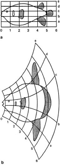 Allometrie Beispiel, wie zwei in der äußeren Form kaum ähnliche, jedoch nahe miteinander verwandte Arten allometrisch voneinander abgeleitet werden können: Bringt man den Umriß des Igelfisches (Diodon hystrix) in ein cartesisches System (a) und deformiert dann die "vertikalen" Koordinaten zu konzentrischen Kreisen und die "horizontalen" zu Kurven, die annähernd Hyperbeln entsprechen (b), dann erhält man nach Punkt-für-Punkt-Übertragung des Diodon-Umrisses auf das neue Koordinatensystem die Form des Mond- oder Sonnenfisches (Orthagoriscus mola). |