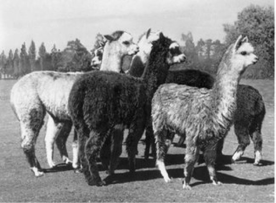 Alpakas [über span. alpaca von Aimara allpaca =], Pako, Lama pacos (syn. Lama guanicoë pacos), nach W. Herre ebenso wie das Lama (Lama glama,Lamas) eine Haustierform des Guanako. Das nur etwa schafgroße Alpaka ( vgl. Abb. ) wird im südlichen Peru und im westlichen Bolivien auf den Hochsteppen der Anden in großen Herden halbwild gehalten und ist mit seinem bis zu 50 cm langen Fell als Wollieferant (Alpakawolle;Wolle) sehr geschätzt. Vermutlich wurde das Alpaka bereits von den Vorgängern der Inkas zur Wollegewinnung gezüchtet. Haustiere, Haustierwerdung, Lamas; Südamerika VI.