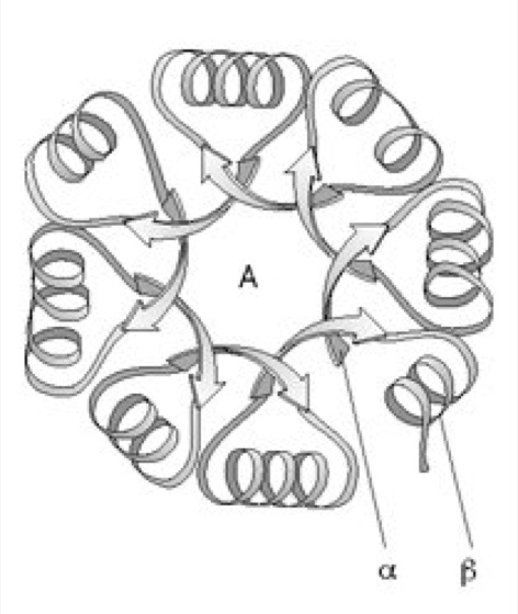 Schematische Darstellung eines αβ-Barrels. A aktives Zentrum des Enzyms, α Bereich mit α-Helix-Struktur, β Bereich mit β-Faltblatt-Struktur