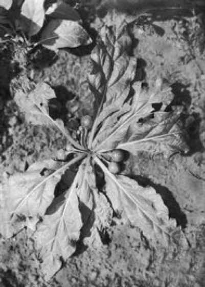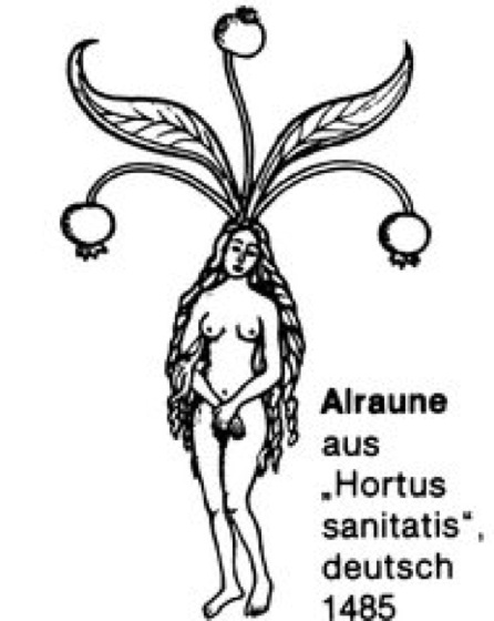 Alraune w [althochdeutsch alrūn(a), bisher abgeleitet von alb = Kobold, Alp und runen = heimlich reden, flüstern (Hinweis auf magische Wirkung der Pflanze)], Alraun, Mandragora, Gattung der Nachtschattengewächse mit 4–6 Arten, deren Areal sich vom Mittelmeerraum über Südwestasien bis zum Himalaya erstreckt. Von besonderem Interesse ist die in Europa und dem Nahen Osten heimische Mandragora officinarum, eine ausdauernde krautige Pflanze mit einer 60–90 cm langen, bis 4 cm dicken, meist gabelig gespaltenen Wurzel ( vgl. Abb. ) und rosettenförmig angeordneten, kurzstieligen, breit-eiförmigen, bis ca. 30 cm langen Blättern ( vgl. Abb. ) sowie gestielten, ca. 3 cm langen, grünlich-weißen, fünfzipflig-glockenförmigen Blüten, aus denen etwa tomatengroße, stark duftende gelbe Beeren entstehen. Die stark giftige Art, die insbesondere die Alkaloide Atropin, Hyoscyamin und Scopolamin enthält, war schon den alten Ägyptern bekannt und spielte im antiken Griechenland sowie im Mittelalter eine bedeutende Rolle in Heilkunst und Magie. Ihre narkotisierende Wirkung war Anlaß zur Verwendung als Beruhigungs- und Betäubungsmittel. Die vor allem durch Atropin und Hyoscyamin hervorgerufenen Erregungszustände mit Halluzinationen (Fliegen, Gespenstersehen usw.) und die sexuell stimulierenden Eigenschaften der Droge führten zu ihrer Anwendung als Liebestrank (Aphrodisiakum) und Zaubermittel (Bestandteil von Hexensalben). Aus den oftmals menschenähnlich gestalteten Alraunwurzeln schnitzte man Figuren (Alraunmännlein und Alraunweiblein), die als Abwehrmittel gegen böse Geister angesehen und daher als glücksbringende Zaubermittel gehandelt wurden ( vgl. Abb. ). Mediterranregion IV.