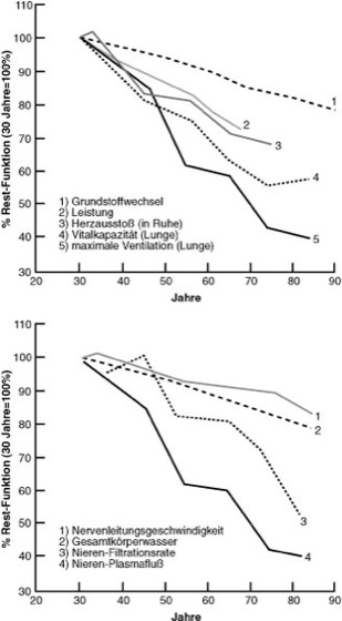 Eine ganze Palette von diagnostischen Parametern, die mit dem Altern beim Menschen einhergehen, sind allgemein geläufig. So zielt etwa die alte Volksweisheit, daß der Mensch so alt sei wie seine Arterien, auf die Tatsache hin, daß mit fortschreitendem Altern die Schlagadern durch Ablagerungen von Fett (Lipoproteine) und Kalk starr und spröde werden. Die daraus resultierende Arteriosklerose führt schließlich irreversibel zum Altern und Tod. Auch Organe mit nicht mehr teilungsfähigen Zellen und solche Organe, die von außen nach innen wachsen und den Ausfall zentraler Strukturen nicht ersetzen können, erleiden sukzessive Dauerveränderungen (z. B. Rippenknorpel, Augenlinse). Allgemein nehmen die voll funktionstüchtigen G
