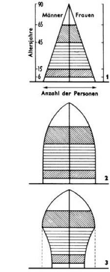 Grundformen der Altersgliederung: 1 wachsende Bevölkerung (Pyramide), 2 stationäre Bevölkerung (Glocke), 3 schrumpfende Bevölkerung (Urne)