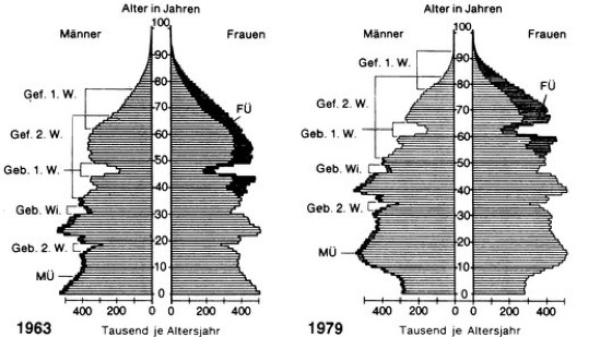 Wie schnell sich die Altersgliederung einer Bevölkerung verändern kann, zeigt die Gegenüberstellung der Altersgliederung in der Bundesrepublik Deutschland von 1963 und 1979: Die eher einer Glockenform entsprechende Pyramide der Altersgliederung (1963) ist in eine Urnenform (1979) übergegangen, die die Tendenz der abnehmenden Bevölkerung in der Bundesrepublik Deutschland (alte Bundesländer) widerspiegelt.