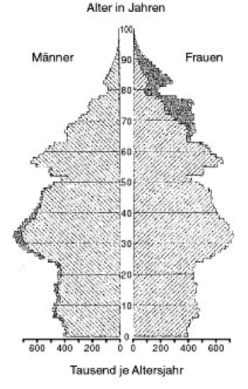 Altersgliederung in der Bundesrepublik Deutschland am 31. 12. 1996 (alte und neue Bundesländer; gerasterte Flächen: Männer- bzw. Frauenüberschuß). Der "Bauch" bei den Dreißigjährigen in der eine deutliche Urnenform zeigenden Alterspyramide ist Ausdruck des "Baby-Booms", die auffällige Lücke bei den Fünfzigjährigen und jene bei den Achtzigjährigen zeigt Geburtenausfälle Ende des 2. bzw. während des 1. Weltkriegs an. Im Zeitraum der Erfassung betrug die Gesamtzahl der Bevölkerung Deutschlands ca. 82 Millionen, davon waren 42 Millionen weiblichen und knapp 40 Millionen männlichen Geschlechts.