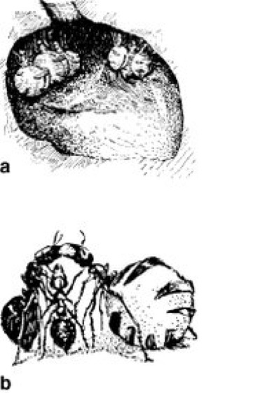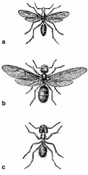 Als soziale Insekten treten die 0,8–6 cm großen Ameisen in Form verschiedener Kasten (Morphen; vgl. Abb. ) entweder als Geschlechtstiere (bisexuell reproduktive Königinnen und Männchen [Drohnen]), oder als Arbeiterinnen auf (Arbeitsteilung). Die Geschlechtstiere sind meist zunächst geflügelt und führen eine Art Hochzeitsflug aus, oft in großen Schwärmen. Die geflügelten Königinnen ( vgl. Abb. ), auch als Gynomorphe bezeichnet, werfen jedoch zur oder nach der Begattung an einer präformierten Bruchstelle die Flügel ab. Auch die Flugmuskulatur (Flugmuskeln) wird dann abgebaut. Manche Arten besitzen kleine, geflügelte Zwergköniginnen (Microgyne, Mikrogyne). Solche Zwerge finden sich vor allem bei sozialparasitischen Ameisen. Gelegentlich treten auch sog. Intermorphe (früher als ergatoid, ergatomorph oder ergatogyn, also Arbeiterinnen-ähnlich, bezeichnet) auf, die keine Flügel haben, aber voll entwickelte Keimdrüsen besitzen. In einem Nest ( vgl. Abb. ) befindet sich entweder nur eine Königin (monogyn, Monogynie; Haplometrose), oder es sind fakultativ oder obligatorisch mehrere bis sogar zahlreiche Königinnen (polygyn, Polygynie; Pleometrose) vorhanden. Arbeiterinnen haben nur schwach entwickelte Keimdrüsen, eine rückgebildete Samenkapsel (Receptaculum seminis) und sind stets flügellos. Zur Eiablage bei Arbeiterinnen kann es bei Verlust der Königin kommen. Da die Eier unbefruchtet sind, sind die daraus schlüpfenden Nachkommen, wie bei allen Hautflüglern, in der Regel Männchen. In besonderen Fällen können daraus durch spezielle Fütterungen auch Weibchen (Königinnen oder Arbeiterinnen) entstehen. Gelegentlich legen Arbeiterinnen auch regelmäßig Nähreier (trophische Eier), die zur Fütterung der Larven benutzt werden (so bei den Weberameisen der Gattung Oecophylla). Arbeiterinnen können entweder als Kaste alle gleich (monomorph) ausgebildet oder in 2–3 Subkasten aufgeteilt sein, die sich hauptsächlich durch unterschiedliche Körpergrößen, Kopfumrisse und relative Kopfgrößen unterscheiden. Die großen Individuen fungieren meist als Soldaten, denen aber oft neben Verteidigung oder Angriffen auf andere Ameisen und Termiten auch Spezialaufgaben beim Nestbau und der Nahrungsaufbereitung zukommen können. Eine extreme Form einer Arbeiterinnenkaste sind die Honigtöpfe ( vgl. Abb. ) der nordamerikanischen Gattung Myrmecocystus (Schuppenameisen) und in abgeschwächter Form der südeuropäischen Art Proformica nasuta. Hier fungieren die Tiere als große oder gar übergroße Nahrungsspeicher, indem ihr Kropf den gesamten Gaster ausfüllt und mit Honig angefüllt ist.