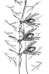 | 5 | ![]() | Ameisen 1 Ameisenköniginnen besitzen Flügel, die nach dem Hochzeitsflug abgeworfen werden: Königin a einer Art der Knotenameisen (Familie Myrmicidae), b einer Art der zur Familie Schuppenameisen (Formicidae) gehörenden Roßameise der Gattung Camponotus (Holzameise). 2 Ameisenkönigin bei der Nestgründung (in einem hohlen Pflanzenstengel, zum Photographieren aufgeschnitten) mit ihrem 1. Gelege; das Weibchen hat bereits die Flügel abgeworfen. 3 Bei vielen Ameisenarten werden die Erdnester durch Hügelkonstruktionen (Ameisenhügel) ergänzt, die klimatechnische Bedeutung haben: Hügel a einer Waldameisen-Art (Gattung Formica), b einer Lasius-Art. 4 Wie bei vielen anderen Ameisenarten auch, spinnen die Larven der Gattung Camponotus im letzten Larvenstadium einen Kokon aus Sekret, in dem sie sich verpuppen; diese Puppen werden oft (fälschlicherweise) als "Ameiseneier" bezeichnet. 5 Der von verschiedenen Läusen abgegebene Kot (Honigtau) enthält große Mengen Aminosäuren und Zucker und stellt für Ameisen eine hochwertige Nahrung dar. Für viele Ameisen ist diese Ausscheidung die Hauptenergiequelle (Trophobiose); das Bild zeigt Arbeiterinnen der Wiesenameise (Formica pratense) an einer Blattlauskolonie. |