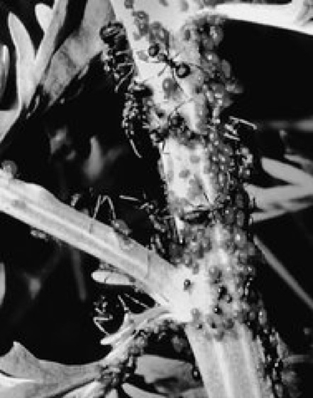 Die Nahrung der Ameisen ist sehr vielfältig. Zur eigenen Imaginalernährung dienen vor allem süße Säfte verschiedener Art (Honigtau, Sekrete aus floralen und extrafloralen Nektarien, Ausscheidungen von Blattläusen, Schildläusen, Zikaden, Abscheidungen von Bläulingsraupen und ähnliches). Manche Arten sind vollständig auf diese Art Nahrung angewiesen (Arten der Gattungen Lasius, Camponotus, Crematogaster, Myrmica). Dazu werden Blattlauskolonien (Blattläuse) in Nestnähe oder gar in ihren unterirdischen Nestern (Lasius flavus) intensiv gepflegt. Daneben kommt auch gegenseitiger Nahrungsaustausch der gerade im Kropf befindlichen Nahrung zwischen Nestgenossen (Trophallaxis) vor. Die übliche Form der Trophallaxis findet zwischen Larven und Arbeiterinnen statt; diejenige zwischen Arbeiterinnen hat vermutlich eher die Funktion sozialer Kontakte. Die meisten Arten sind zur Ernährung ihrer Brut generalisierte 1. Räuber: Hier werden vor allem in erster Linie Insekten und andere Kleintiere gesucht und erbeutet. Eine Spezialisierung auf bestimmte Beutetiere ist eher selten. Unter den Knotenameisen fangen manche bodenlebende Arten der südamerikanischen Gattungsgruppe Dacetini vor allem Springschwänze. Bei größerer Beute wird versucht, diese durch Rekrutierung weiterer Nestgenossen gemeinschaftlich zu fangen und abzutransportieren. Auf Gruppenjagd spezialisiert sind vor allem die Treiberameisen der Tropen. Der Beuteeintrag großer Ameisenkolonien kann pro Jahr beträchtlich sein. So wurde für eine mittelgroße Kolonie der Kleinen Roten Waldameise ermittelt, daß sie von einer 2500 m2 großen Waldfläche in einem Jahr etwa 6 Millionen Beutetiere (meist Raupen und Blattwespenlarven) einträgt. 2. Granivore: In Halbwüsten und Steppengebieten trägt eine Reihe von Ameisengruppen verschiedene Pflanzensamen (z. B. Gräser, Getreide) ein (Ernteameisen), die im Nest zu einer Art Ameisenbrot zerkaut und gefressen werden. Begehrt sind auch einige Pflanzensamen mit ölhaltigen Anhängseln (Elaiosomen). Hier werden nur diese Anhängsel gefressen. Dadurch werden solche Samen besonders effektiv ausgebreitet (Myrmekochorie, Samenausbreitung). 3. Pilzzüchter: vor allem die südamerikanischen Blattschneiderameisen tragen grüne Blattstücke ein, die zerkaut als Nährboden für eine Pilzzucht ( vgl. Abb. ) dienen. 4. Gelegenheitsdiebe und echte Diebsameisen: manche Arten der Waldameisen-Gruppe sind gegenüber kleineren anderen Ameisen Gelegenheitsdiebe, indem sie diesen überfallartig und ohne Risiko auf Kampf ihre Beute wegnehmen. Dagegen sind bei uns die Diebsameise (Solenopsis fugax) und die eingeschleppte winzige Pharaonenameise (Monomorium pharaonis;Knotenameisen) obligatorische Diebe (Kleptobionten; Kleptoparasitismus), die als Nahrung die Brut aus anderen Ameisennestern stehlen. Dazu legen sie eigene kleine Tunnel zu diesen Nestern an; in einer Brutkammer angekommen, versprühen sie aus ihren Giftdrüsen alkaloide Substanzen, die die Wirtsameisen völlig abschrecken. – Finden von Nahrungsquellen: Von den Nestern werden fixe Routen verfolgt, die zu den Jagdgründen und/oder Blattlauskolonien führen. Da sie oft jahrelang benutzt werden, sind sie als schmale vegetationslose Straßen erkennbar. Ameisen haben sehr unterschiedliche Orientierungsleistungen, die zu immer größeren Entfernungen und vor allem wieder zum Nest zurückführen. Dabei werden optische Landmarken, Tastsinn, vor allem aber Duftspuren und sogar Sonnenkompaßorientierung eingesetzt. Nach einer Beutelokalisation wird entweder eine gezielte Duftspur zur Rekrutierung von neuen Nestgenossen gelegt, oder die Ameisen fressen sich selbst satt (bei kleinerer Beute) und füttern später über Trophallaxis weiter.