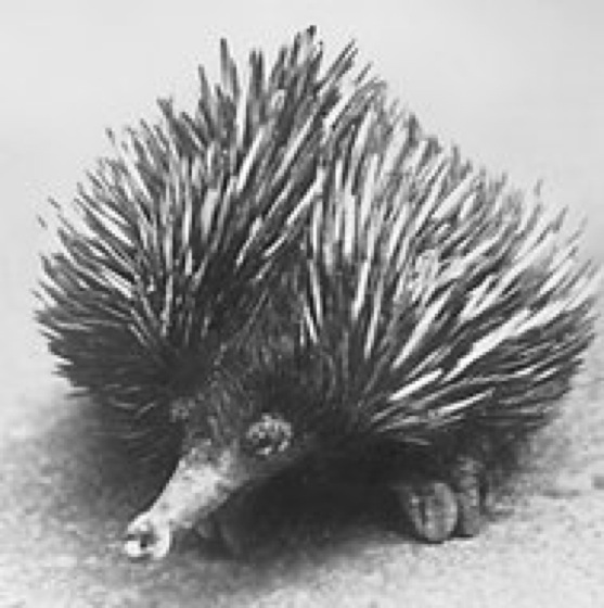 Ameisenigel, Schnabeligel, Tachyglossidae, Familie der eierlegenden Kloakentiere mit den 2 Gattungen ( vgl. Tab. ) Tachyglossus (früher: Echidna, Kurzschnabeligel) und Zaglossus (Langschnabeligel) in Australien, Neuguinea und Tasmanien; nächstverwandt mit dem Schnabeltier (Schnabeltiere). Ameisenigel sind etwas plump erscheinende Tiere mit einer Körperlänge zwischen 40 und 80 cm, behaart und oberseits bestachelt ( vgl. Abb. ). Sie sind dämmerungs- bzw. nachtaktiv und können sich bei Gefahr wie unsere Igel kugelförmig einrollen oder sich mit ihren krallenbewehrten Füßen geschickt eingraben. Die schnabelförmige und im Querschnitt runde Schnauze ist hornüberzogen und trägt eine enge Mundspalte, aus der eine lang ausstülpbare, wurmförmige Zunge Ameisen, Termiten, andere Insekten und Würmer auflecken kann. Ameisenigel besitzen keine Zähne, statt dessen Hornleisten am Gaumen zum Zerquetschen der Nahrung. Sie repräsentieren unter den Kloakentieren den Lebensformtypus des Ameisenfressers. Weibliche Ameisenigel entwickeln während der Fortpflanzungszeit vorübergehend eine Bruttasche in Bauchmitte (nicht homolog mit dem Beutel der Beuteltiere!), in die 2 mit Haarbüscheln ausgestattete Milchfelder münden. Das Muttertier befördert das Ei (meist nur 1) von der Kloake direkt in die Bruttasche. Nach 7–10 Tagen schlüpft das nur 12 mm große Junge; es wird in der Bauchtasche getragen und leckt die aus den Milchdrüsen abgesonderte Milch von den Haaren ab. Nach 6–8 Wochen haben sich seine Stacheln entwickelt, und es wird nun in eine Art Nest abgelegt. Mit 1 Jahr wiegt das Jungtier bereits 2,5–6 kg und ist geschlechtsreif. – Den Kurzschnabeligel sieht man heute meist als 1 Art an (Tachyglossus aculeatus), deren mehrere Unterarten in Australien, auf vorgelagerten Inseln, auf Tasmanien und in Neuguinea leben; einige Autoren betrachten noch den Tasmanien-Kurzschnabeligel als eigene Art ( vgl. Tab. ). Beim Langschnabeligel hat man früher 3 bis 4 Arten unterschieden ( vgl. Tab. ), die heute alle als Unterarten zur einzigen Art Zaglossus bruijni gerechnet werden. Er lebt heute nur noch in Neuguinea und möglicherweise noch auf einer nahen Insel; nach Fossilfunden gab es ihn im Pleistozän auch in Australien. Nach neueren Beobachtungen scheint er sich hauptsächlich von Würmern und kaum oder gar nicht von Ameisen oder Termiten zu ernähren. Ameisenigel gehören zu den wenigen Säugetieren, die über 50 Jahre alt werden können. Man trifft sie nicht selten auch in Zoos. Haake (W.); Australien IV .