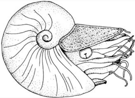 Schematische Rekonstruktion eines Ammoniten der Gattung Aspidoceras (nach Trauth)