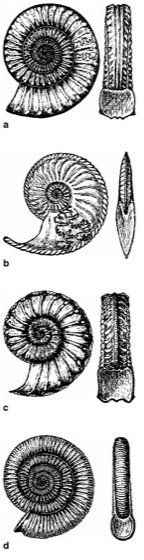a Arietites (unterer Lias), b Amaltheus (mittlerer Lias), c Pleuroceras (mittlerer Lias), d Dactylioceras (oberer Lias)