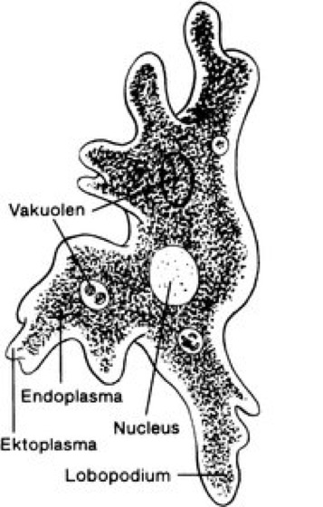 Amoeba w [von ö *amoeb -], artenreiche Gattung der Nacktamöben; ihr Körper kann an allen Stellen lappenförmige Lobopodien (Pseudopodien) bilden. Eine der häufigsten und bekanntesten Arten ( vgl. Abb. ) ist Amoeba proteus (Chaos diffluens), ein bis 600 μm großer Allesfresser, der sich besonders von Bakterien und Pantoffeltierchen ernährt und dementsprechend in leicht fauligen, bakterienreichen Tümpeln lebt. Andere Arten kommen auch in Sümpfen und auf Wasserpflanzen vor. Aufgußtierchen, Endoplasma, Endosymbiose (Farbtafel), Zoochlorellen.