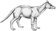 Anoplotherium s [von *anoplo –, griech. thērion = Wildtier], ausgestorbene Gattung der Paarhufer aus dem oberen Eozän und unteren Oligozän Europas; erreicht wie die anderen Mitglieder der Familie Anoplotheriidae eine Schulterhöhe von etwa 1 m, ist kurzbeinig, schwergewichtig und hat einen ungewöhnlich langen Schwanz ( vgl. Abb. ). Das Gebiß enthält oben Mahlzähne mit einer fünfhöckerigen Krone, wobei die inneren Höcker bei Anoplotherium bunodont (kegelförmig), die äußeren selenodont (halbmondförmig) sind.