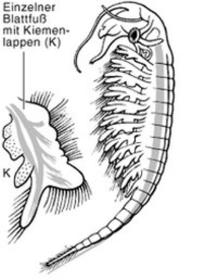 Anostraca [von griech. an- = nicht, ostrakon = Schale], Kiemenfußkrebse, Kiemenfüßer, von einigen Autoren als eigene Unterklasse der Krebstiere, von anderen als Ordnung der Branchiopoda aufgefaßt; ca. 175 Arten ( vgl. Tab. ). Kiemenfußkrebse sind urtümliche, weichhäutige Tiere mit langgestrecktem Körper ohne Carapax. Auf den Kopf folgen 11 (bei den Polyartemiidae 17 bis 19) Thorakomeren mit gleichartig gestalteten Blattfüßen (Blattbeine) und ein beinloses Abdomen aus 8 Segmenten, das mit einer Furca endet. Die beiden vordersten Abdominalsegmente (Abdomen) – oder, nach anderen Vorstellungen, die beiden letzten Thorakalsegmente (der Thorax hätte dann 13 Segmente) – sind verschmolzen und tragen die Geschlechtsöffnungen. Der Kopf trägt große, gestielte Komplexaugen und Naupliusaugen. Die 1. Antennen sind kurz und dünn, die 2. Antennen viel größer und bei den Männchen zu mächtigen, bizarren Klammerorganen (Greifantenne) umgestaltet, den sog. Stirnfortsätzen, die oft geweihartig verzweigt sind (Antenne, Abb.). Die Mandibeln sind einfache Endite ohne Palpen, die Maxillen sind klein und reduziert. Die meisten Arten sind 1 bis wenige cm lang, Branchinecta gigas in Nordamerika erreicht 10 cm. Die Kiemenfußkrebse schwimmen langsam mit dem Rücken nach unten; bei Gefahr können sie sich mit einem Schlag des Abdomens zur Seite schnellen. Beim Schwimmen schlagen die Blattfüße eines Paares synchron, und von hinten nach vorn verlaufen Bewegungswellen über die hintereinander liegenden Beinpaare. Dabei wird gleichzeitig Plankton filtriert, das über eine ventrale Nahrungsrinne nach vorn unter die große Oberlippe und schließlich in den Mund gebracht wird. Alle Arten bewohnen Extrembiotope: das Salinenkrebschen, Artemia salina, Salzseen und Salinen, die meisten anderen Arten ephemere Gewässer, Schmelztümpel und ähnliches. Ihre Eier können (und müssen) austrocknen; sie fallen nach der ersten Gastrulationsphase in eine Diapause. Werden sie überschwemmt, entwickelt sich innerhalb weniger Tage ein Nauplius, der über zahlreiche Metanaupliusstadien heranwächst und dann in einer Metamorphose die larvale Bewegungsweise (Antriebsorgan ist die 2. Antenne) auf die adulte umstellt. Die Adulten leben nur wenige Wochen. Bei der Paarung umklammert das Männchen das Weibchen mit seinen modifizierten 2. Antennen und führt einen seiner beiden Penes in die weibliche Geschlechtsöffnung. Die mit einer festen Schale umgebenen Eier werden zunächst in einer Erweiterung der Genitalsegmente getragen, bevor sie herausfallen. Chirocephalus (Siphonophanes) grubei ist in Mitteleuropa eine Frühjahrsart, die gleich nach der Schneeschmelze auftritt, Branchipus stagnalis ( vgl. Abb. ) eine Sommerart, die von April bis September vorkommen kann. Tanymastix lacunae, in Mitteleuropa im Eichener See bei Schopfheim, entwickelt sich bei Temperaturen unter 16° C. Gliederfüßer; ä Ernährung .