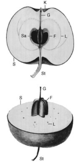 Apfelbaum, Malus, Gattung der Rosengewächse mit ca. 30 Arten, die zwischen dem Kaukasus und der usbekischen Hauptstadt Taschkent ein Mannigfaltigkeitszentrum besitzt (Genzentrentheorie). Genetischen Anteil am Gartenapfel (Malus domestica) haben unter anderem verschiedene Unterarten von Holz-Apfelbaum oder Wald-Apfelbaum (Malus sylvestris, Europa und Westasien; vgl. Abb. , Europa XIV ), Splitt-Apfelbaum oder Doucin-Apfelbaum (Malus mitis), Johannis-Apfelbaum oder Paradies-Apfelbaum (Malus pumila, Europa und Ostasien), vom Pflaumenblättrigen Apfelbaum (Malus prunifolia) und Korallen-Apfelbaum (Malus floribunda, Japan). Der Kirschapfel (Malus baccata, Ostasien) kann entgegen früherer Ansicht aufgrund morphologischer und biochemischer Vergleiche heute nicht mehr als Stammform angesehen werden. Die Kultivierung des Garten-Apfelbaums wird nachweislich seit dem Neolithikum (Jungsteinzeit) betrieben. Schon früh war bekannt, daß bei der Vermehrung gepfropft (Pfropfung) werden muß, da der Apfel als Kernobst spalterbig ist (Mendelsche Regeln). Die Griechen gaben ihren Apfelsorten bereits Namen, und aus der römischen Kaiserzeit sind 23 Sorten beschrieben. Der Höhepunkt der Herauszüchtung von Sorten war das 18. und 19. Jahrhundert, zunächst durch die Suche nach Zufallssämlingen und Mutationschimären (Chimäre), später durch gezielte Kreuzungen auch mit überseeischen Sorten. Heute ist der Gartenapfel mit 7000 (nach anderen Angaben bis 20 000) Sorten und einer Jahresweltproduktion von nahezu 50 Millionen t Äpfeln ( vgl. Tab. ) die wichtigste Obstsorte (Obst) der kühlgemäßigten Zonen Europas (vor allem Deutschlands und Frankreichs), Amerikas, Asiens und Australiens. – Der flachwurzelnde, drehwüchsige (Drehwuchs) Apfelbaum ist durch wechselständige Laubblätter charakterisiert, die klein gekerbt-gesägt, eiförmig und meist zugespitzt sind. Nach Laubausbruch erscheinen rosa überlaufene Blüten in kurzgestielten, armblütigen Doldentrauben. Der Apfel blüht von allen Kern- und Steinobstarten nach der Quitte am spätesten. Seine Blüten bilden sich ausschließlich an Kurztrieben und besitzen 2–5 an der Basis verwachsene Griffel und 15–20 Staubblätter (Hypanthium). Die Sorten-Edelreiser werden auf einer Unterlage von Johannis- oder Holzapfel veredelt. Die meisten Sorten sind selbststeril, viele großfrüchtige triploid (Autopolyploidie). Für ihren Anbau sind in einer Pflanzung mindestens drei verschiedene, gleichzeitig blühende Sorten nötig. Im erwerbsmäßigen Obstbau werden in der Regel niedrigwüchsige Spaliersträucher gezogen. Die als charakteristische Hochstämme (Obstbaumformen) gezogenen Landsorten der Streuobstwiesen sind stark zurückgegangen. Standortsansprüche des Gartenapfels sind: gemäßigtes Klima mit ausreichender Luftfeuchtigkeit, mäßig bewegter Luft und Wintertemperaturen unter dem Gefrierpunkt (Brechen der Knospenruhe), aber ohne Spätfröste; gedeiht auf ausreichend tief entwässerten, nährstoff- und basenreichen Böden. – Die eigentliche Frucht des Apfels, die dem "Kerngehäuse" entspricht, ist eine Sammelbalgfrucht, umgeben von fleischig gewordenem Kelchgrund und Blütenachse, dem Fruchtfleisch ( vgl. Abb. ; Früchte, Kulturpflanzen VII). Die Apfelsorten wurden früher im Dielschen System in 15 "Gruppen" geordnet, die Einteilung erfolgt nach Reifezeit, Form, Farbe, Beschaffenheit der Schale und des Fruchtfleisches, Geschmack und Geruch. Bezeichnungen aus dem Dielschen System wurden unter anderem für die Sorten "Renette" und "Calville" übernommen. Heute erfolgt eine Charakterisierung der Äpfel nach Verwendungszweck, d. h., es wird unterschieden zwischen Tafelobst, Kochäpfeln, Mostäpfeln und Zierbäumen (z. B. KirschApfelbaum und Korallen-Apfelbaum). Der nach Sorte schwankende Vitamin-C-Gehalt beträgt 3–35 mg pro 100 g (Inhaltsstoffe des Apfels vgl. Tab. ). Bei Lagerung von Äpfeln ist zu beachten, daß Ethylenbildung (Ethylen, Ethylen-Synthese) frühreifer Äpfel die Reifung spätreifer Sorten vorzeitig stimuliert. Das Apfelbaumholz ist härter als das Holz des Birnbaums und wurde früher in der Holzbildhauerei und für Holzschnitte genutzt. – Bedeutende Schädlinge des Kulturapfels sind unter anderem der Apfelblattsauger (Psyllina), der Apfelblüten- und Apfelfrucht-Stecher, die Apfellaus (Röhrenläuse), die Apfelsägewespe (Tenthredinidae), die Apfelwanze (Weichwanzen), Vertreter der Borkenkäfer, die Rote Spinne, die San-José-Schildlaus (Deckelschildläuse) sowie die Raupen von Apfelgespinstmotte (Gespinstmotten), Apfelwickler, Baumweißling, Blausieb (Holzbohrer), Frostspanner, Goldafter, Schwammspinner und Weidenbohrer. Unter den von Viren, Mycoplasmen, Bakterien und Pilzen verursachten Apfelkrankheiten sind wichtig Apfel-Fruchtfäule, Apfelmehltau, Apfelschorf (Kernobstschorf), Bitterfäule, Flachästigkeit, Kragenfäule (Phytophthora), durch verschiedene Monilia-Arten verursachte Fruchtfäule, Obstbaumkrebs und Triebsucht (Rickettsienähnliche Organismen). Blatt, Fruchtsäuren (Tab.), Nahrungsmittel, Xenien; Pflanzenkrankheiten II, Schädlinge.