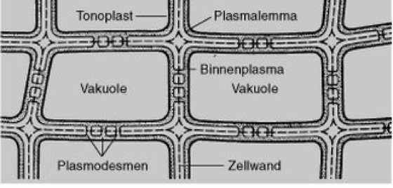 Apoplast m [von *apo –, griech. plastos = geformt], Bezeichnung für den freien Diffusionsraum der Zellwände (Zellwand) sowie das Lumen der Xylemelemente (Xylem). Der Apoplast ( vgl. Abb. ) umgibt den Symplasten (Verband der durch Plasmodesmen miteinander verbundenen Protoplasten; Symplast). Bei den Höheren Landpflanzen ist der Apoplast gegen die Atmosphäre durch eine wasserundurchlässige Hülle (Cuticula, Periderm) abgedichtet. Im Bereich der Wurzelhaare (Wurzel) ist der Apoplast jedoch offen für die wäßrige Phase der Umgebung. Der freie Diffusionsraum der äußeren Wurzelschichten endet an der Endodermis, wo der Casparysche Streifen die freie Diffusion zwischen dem Apoplasten des Cortex und dem Apoplasten des Zentralzylinders stark einschränkt. Assimilattransport, Wassertransport.