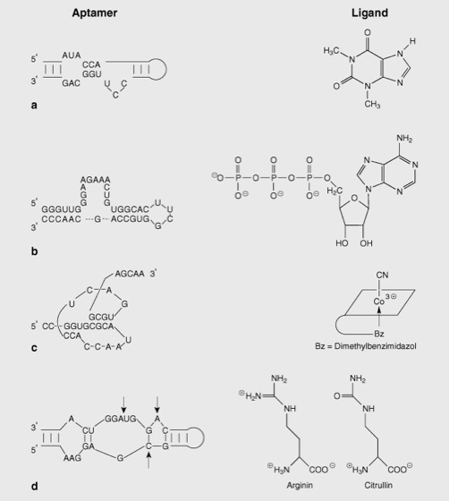 Aptamer s, Nucleinsäuremolekülart mit spezifischen Bindeeigenschaften (vgl. Abb.). Aptamere werden in der Regel über in-vitro-Evolution gewonnen.