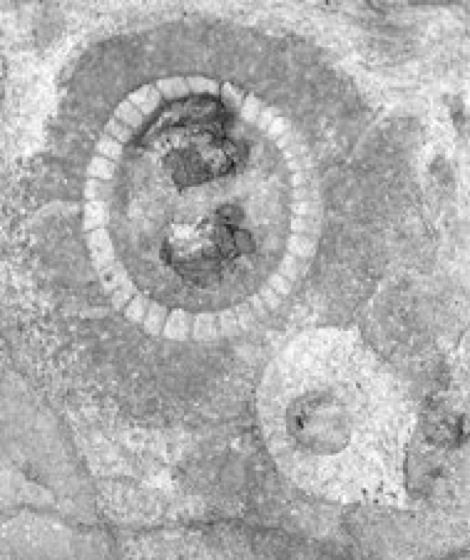 1 Schematische Darstellung eines typischen Archaeocyathiden, zum Teil aufgeschnitten; 2 Querschnitt durch einen Vertreter der Archaeocyathiden