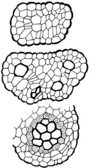 Entwicklung des Archespors (dick umrandet) von 4 Pollensäcken einer Anthere (Staubbeutel); Nährzellen (punktiert) dienen später der Ernährung der Pollen.