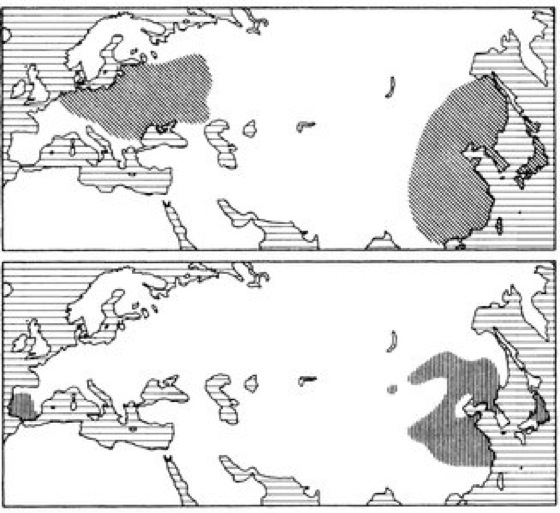 Zwei bekannte Fälle von disjunkter Verbreitung: oben Schlammpeitzger (Misgurnus fossilis), unten Blauelster (Cyanopica cyanus)